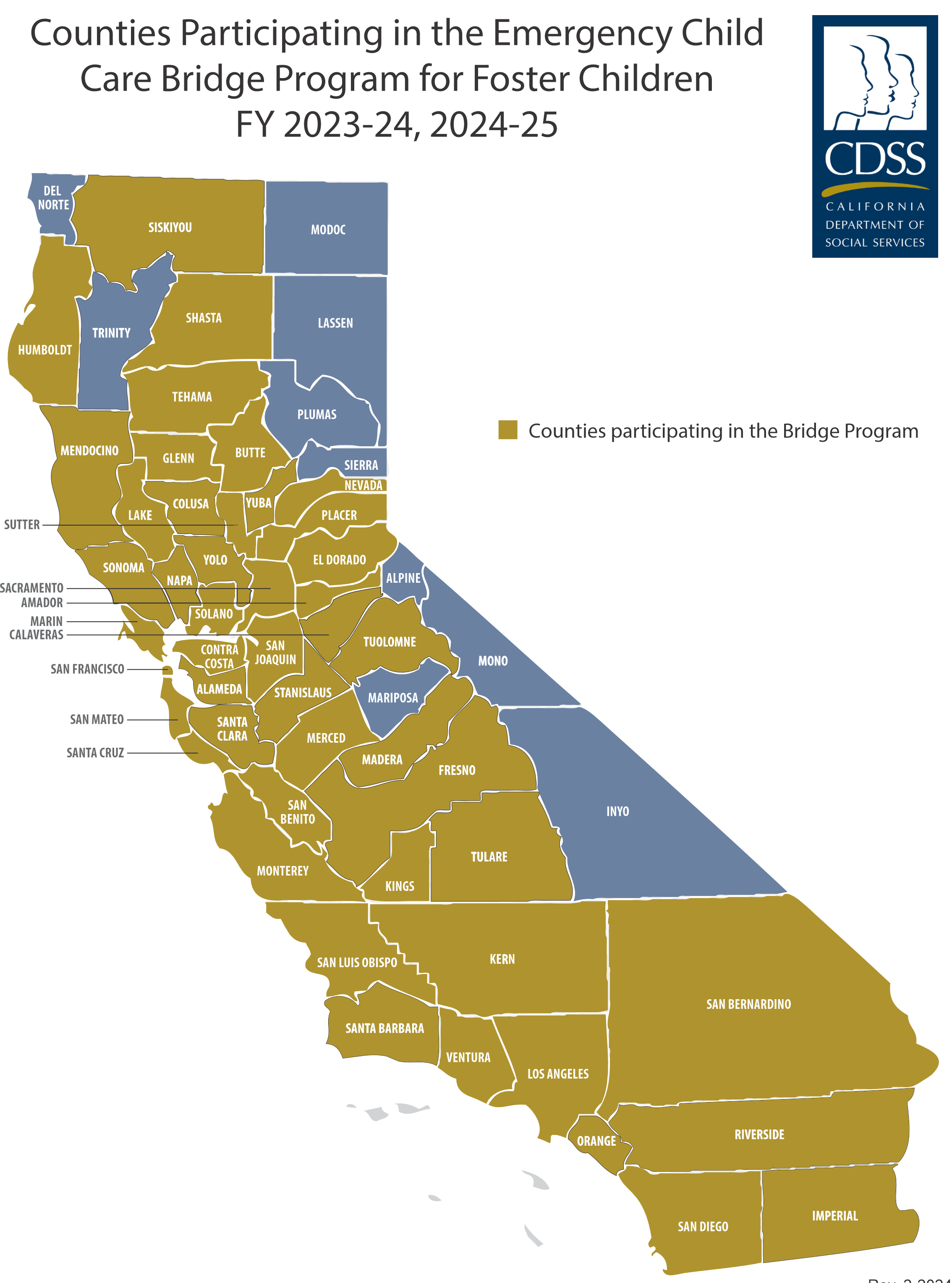 The Emergency Child Care Bridge Program (Bridge Program) aims to facilitate the immediate placement of children within the foster care system into a stable child care and development setting by helping relatives, parenting youth under the jurisdiction of the court, or foster/resource families obtain child care services upon placement.  It provides time-limited vouchers for child care and child care navigator services for families to assist with accessing child care. There is also a Trauma-Informed Care (TIC) training and coaching component for child care providers to enhance their ability to provide nurturing and safe environments for children.